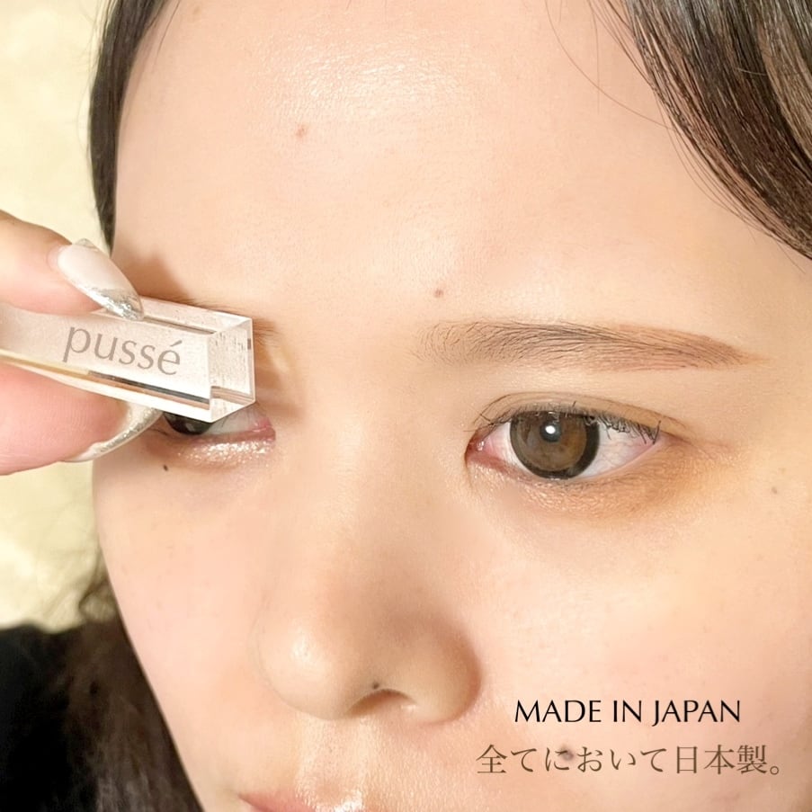 『pussé』は、わたくしども老舗の「眉毛サロン」が、様々な理由で眉に悩む多くの方々のお役に立てればと、このプロジェクトにご賛同下さるその道のプロの方々のご協力を得て、長年にわたり開発し完成したものです。全てにおいて日本製で、職人の方々が丁寧につくってくださっています。この『pussé』が少しでも皆様のお役に立てれば幸いでございます。